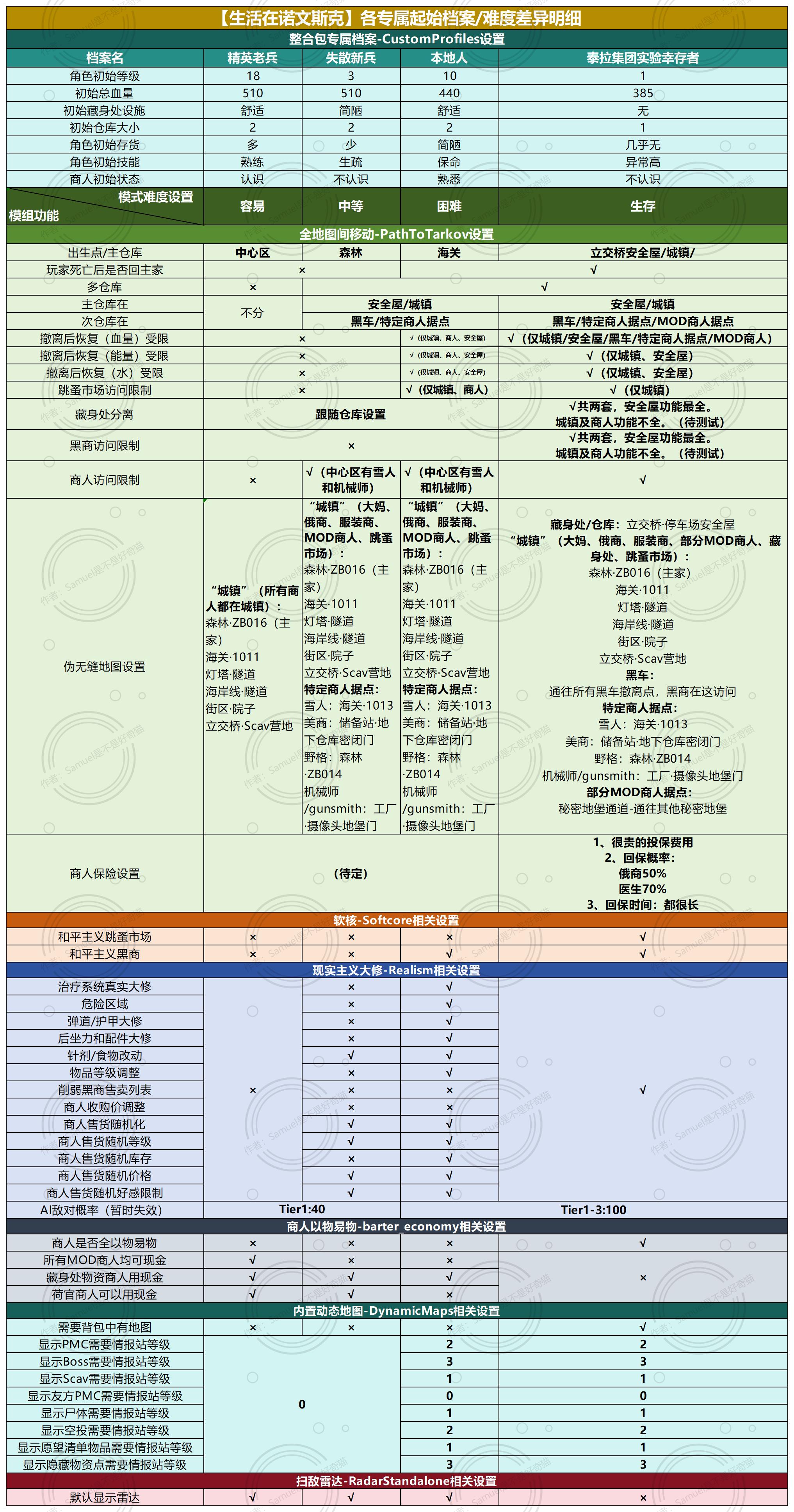 四种角色的区别主要在于出生的主家、血量、初始装备和库存、初始技能以及不同的商人好感度,“整合包专属任务线”未来会对不同角色设计不同的起始任务: